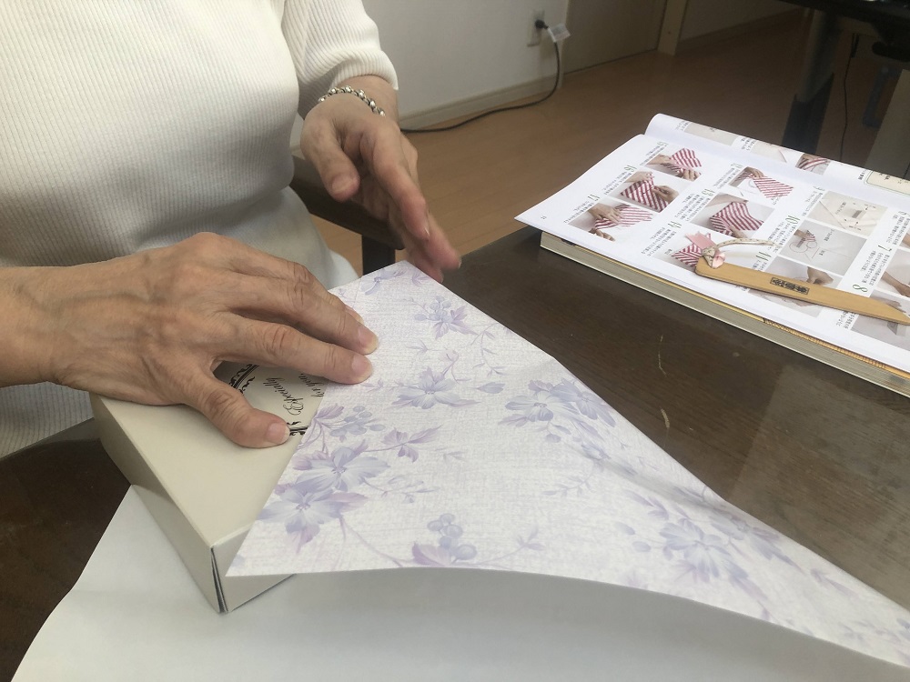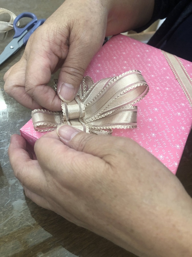今日は斜め包みの勉強なので、リボンは楽しんでいただきます。