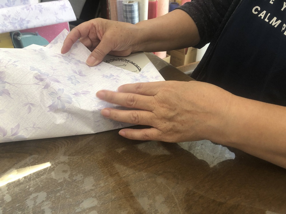 祝儀の斜め包みは、方向性がある包装紙で行ってもらいます。