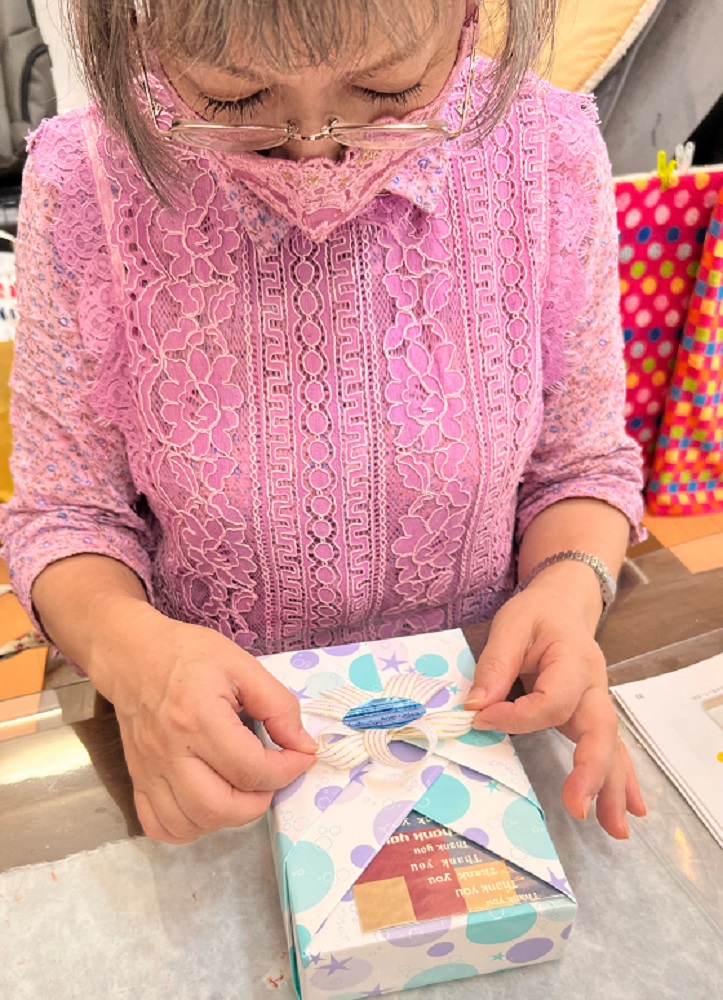 次も箱に入っていない商品を綺麗に包む作品を行いました。
