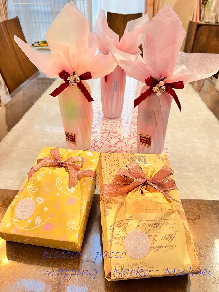 ボトルも違う包みを見て頂いたり、リボンの新しい掛け方など、沢山の内容を覚えて頂きました。