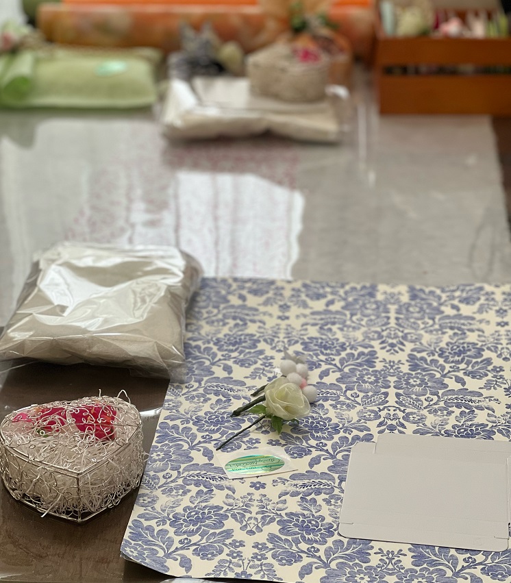 不織布を多く使うので、あまり机に材料がありませんが、作品は華やかな物になります。