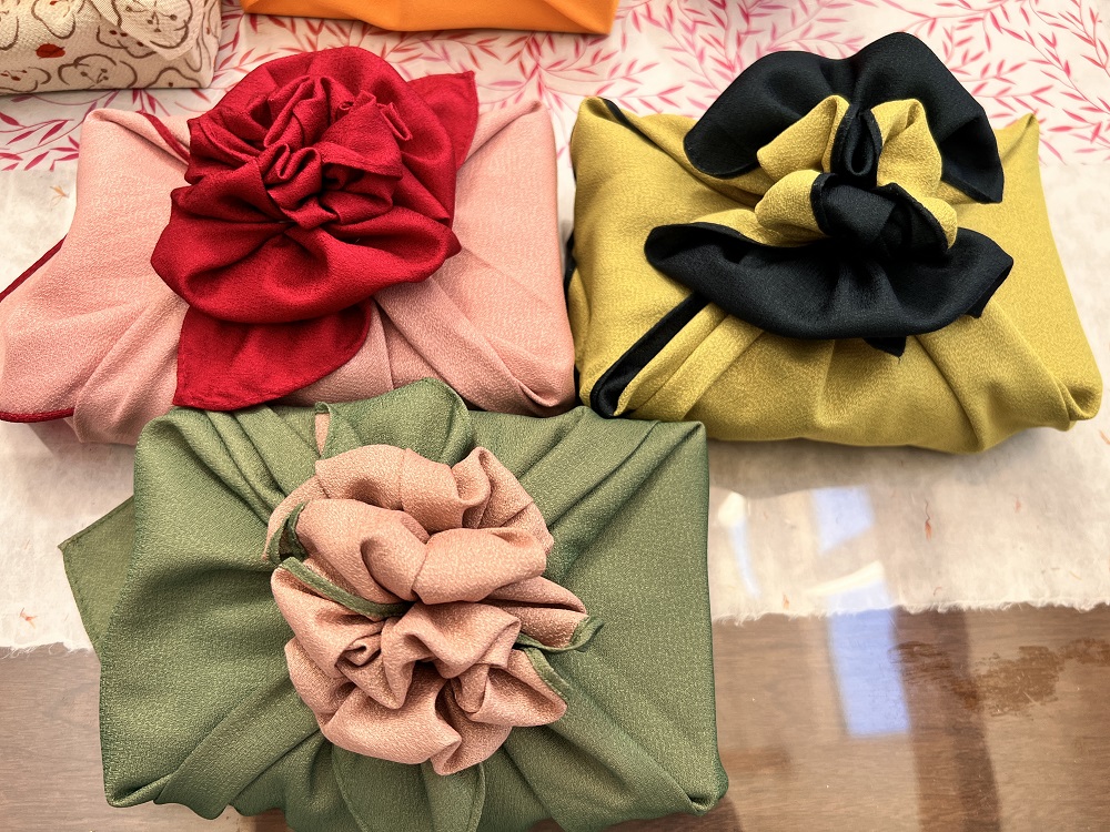 本を包んだり、バックを作ってみたりと、合計13~14種類の風呂敷包みを体験してもらいました。