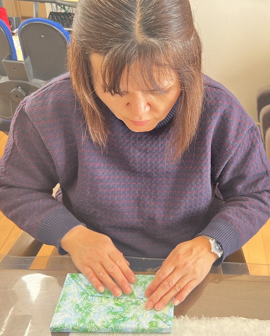 包装紙も、お仕事場で扱っている薄さに近い包装紙で包む練習をしてもらいました。